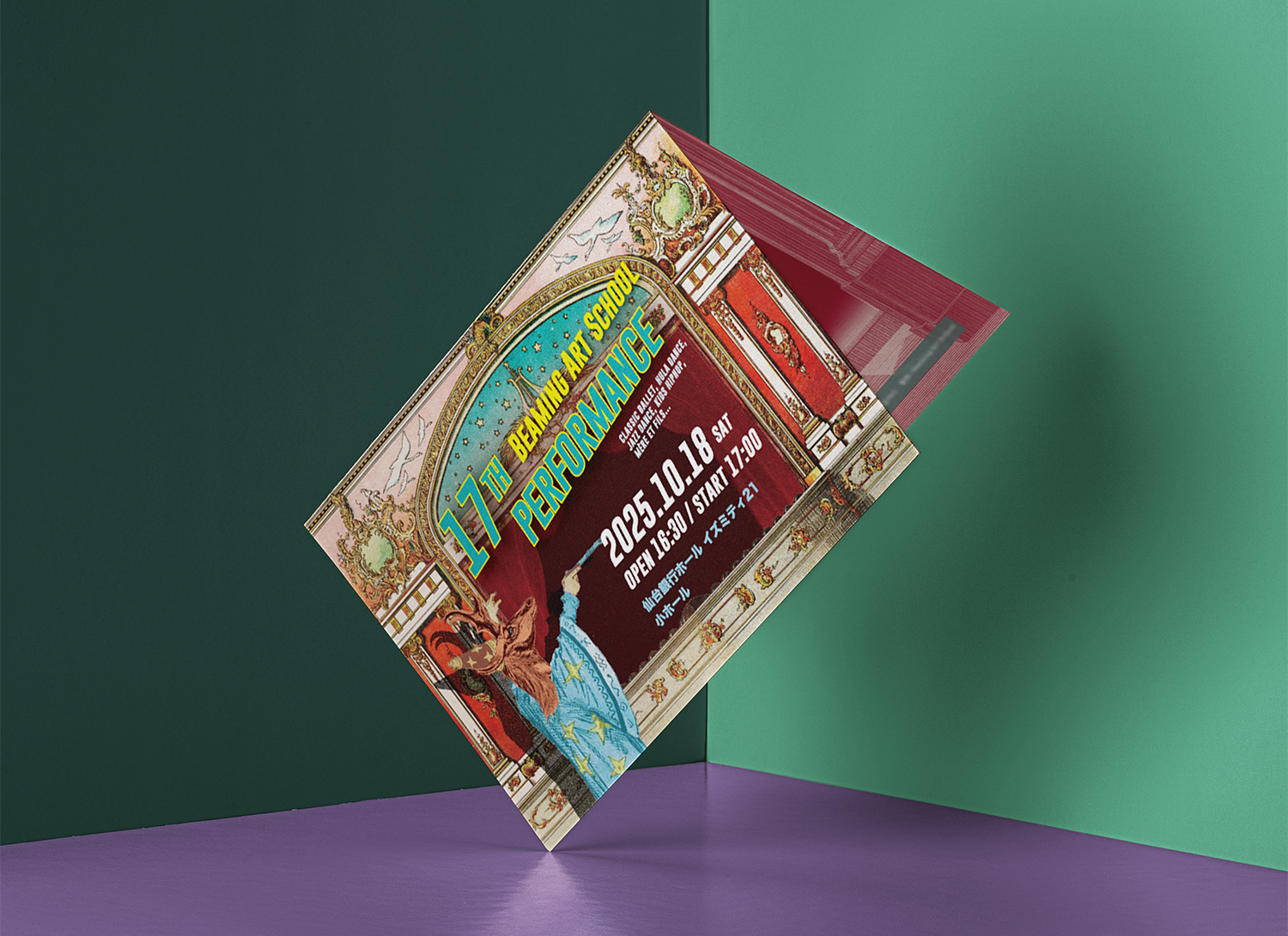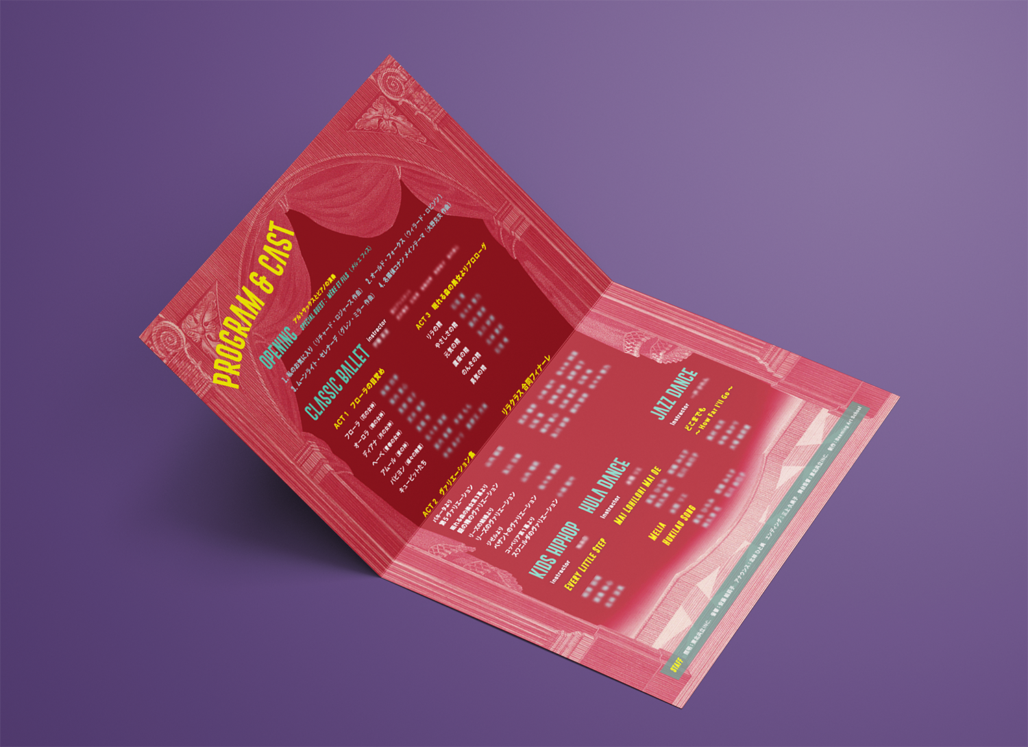 アートスクールの発表会プログラムのイラストレーションとデザインを担当。幕が上がるその瞬間の高鳴りを、物語のはじまりを告げる劇場の世界観に重ねました。